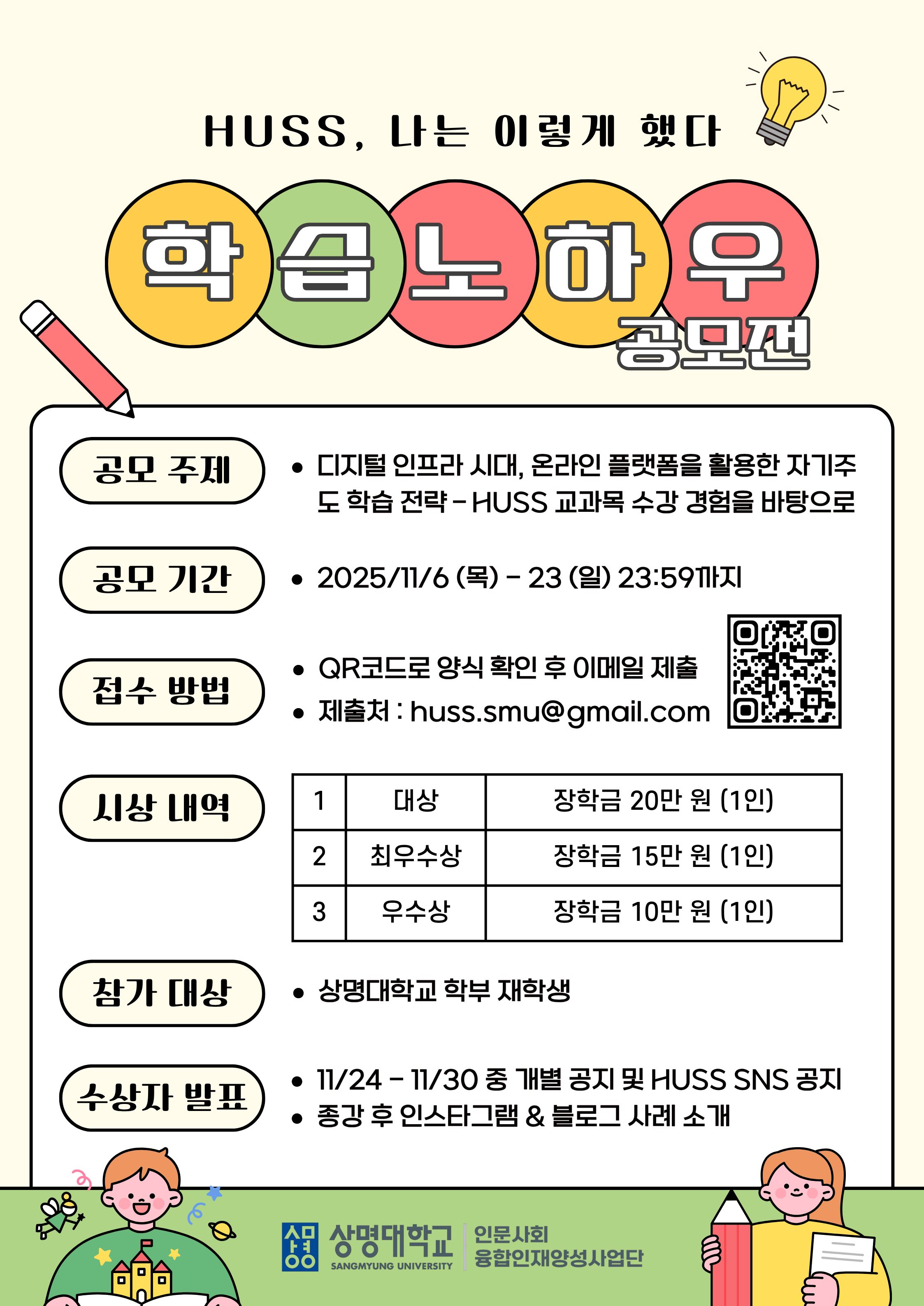 | 상명 [비교과] | [HUSS 인문사회융합인재양성사업단] 'HUSS, 나는 이렇게 했다!: 나만의 학습 노하우 공모전' 안내 |