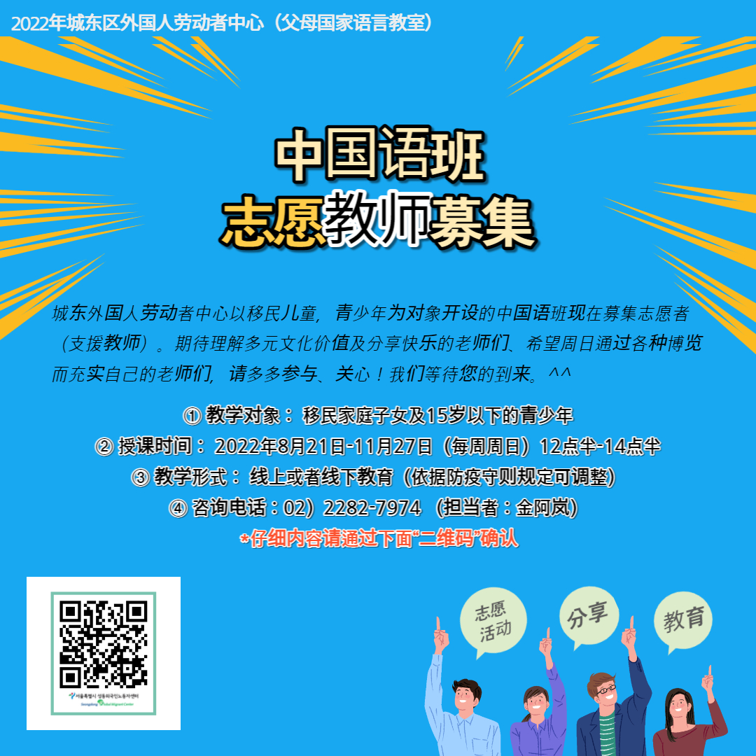 - [생활] 이주민 가정 아동 및 청소년을 대상으로 '부모나라 말 배우기 교실' 교육봉사자 모집